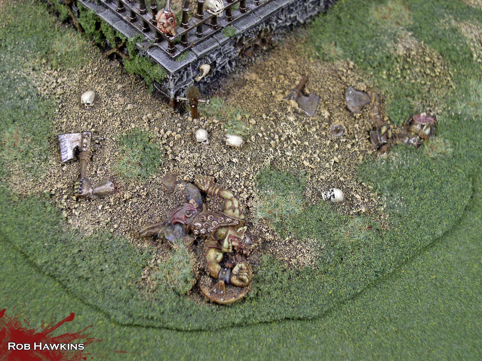 Since this was for a campaign, and one of my primary adversaries was Orcs & Goblins, I added a few Orc casualties on the premises. Mordheim casualty markers and some spare model parts can be seen here.