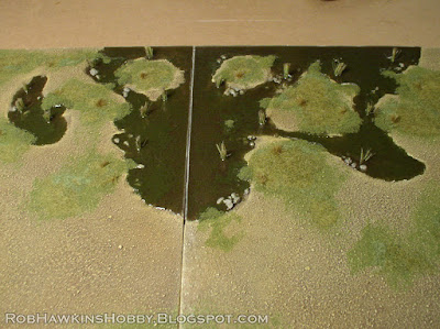 I made some modular swamp terrain for each of the tables. The style of these matched the grass and water in the recessed swamps on the board corners.