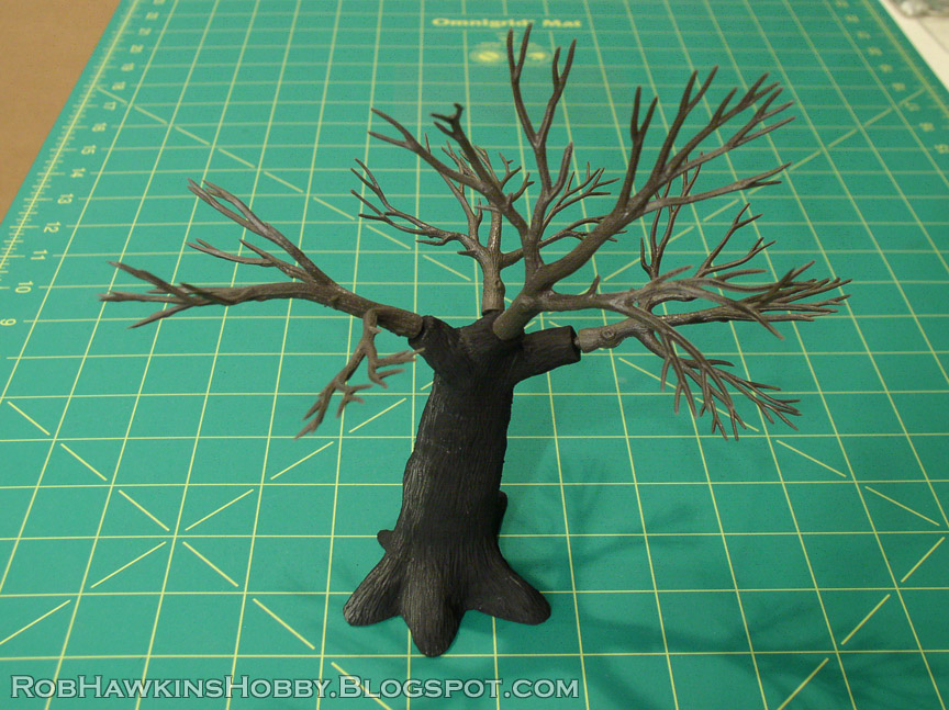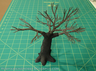 To make some suitably creepy trees, I started by sculpting a large tree trunk and made a few resin castings of it. Woodland Scenics plastic tree armatures were pegged into the tops to create a larger tree.