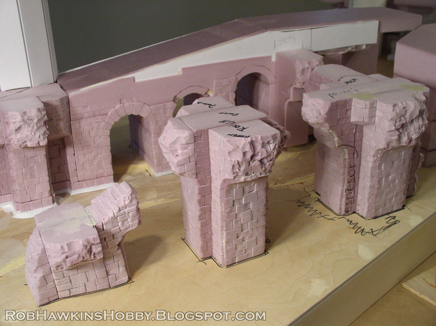I shaped the foam and attached all the parts for the platforms. The steps were cut out, and I began cutting the stonework into the surface of the foam. The bridge arches were cut out of the foam core and insulation foam was used to form the support walls between the arches.