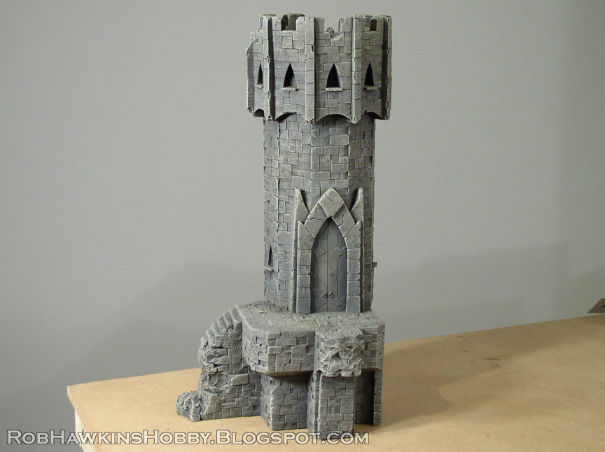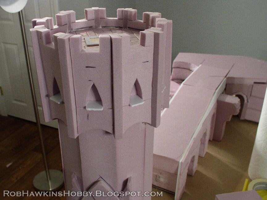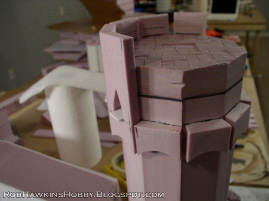 I covered the walls of the tower with long strips of foam, cut to 1/4-inch thick. The top was capped with a piece of one-inch foam. I cut out an archway for a door and attached this to the tower. You can barely see it on the side, but there were windows cut out of the foam, with thick PVC card for the window ledge.