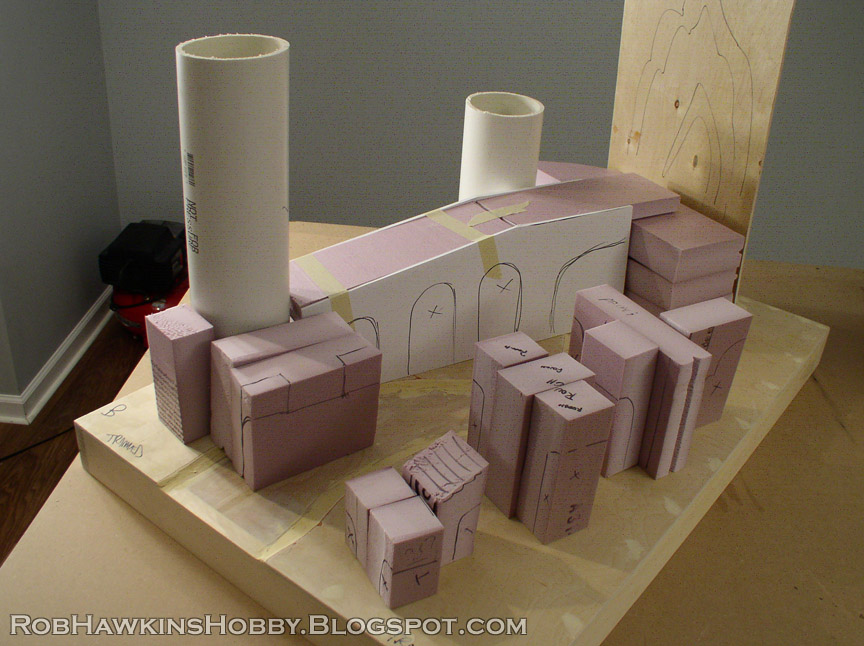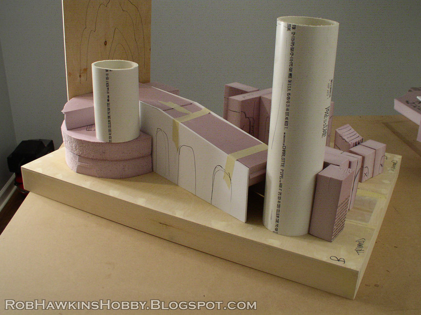 The PVC pipe was covered with foam board to give it a decagonal shape and flat, vertical sides over which I could attach foam. stonework Around the base of the tower, I framed out a platform that connected to the large bridge.