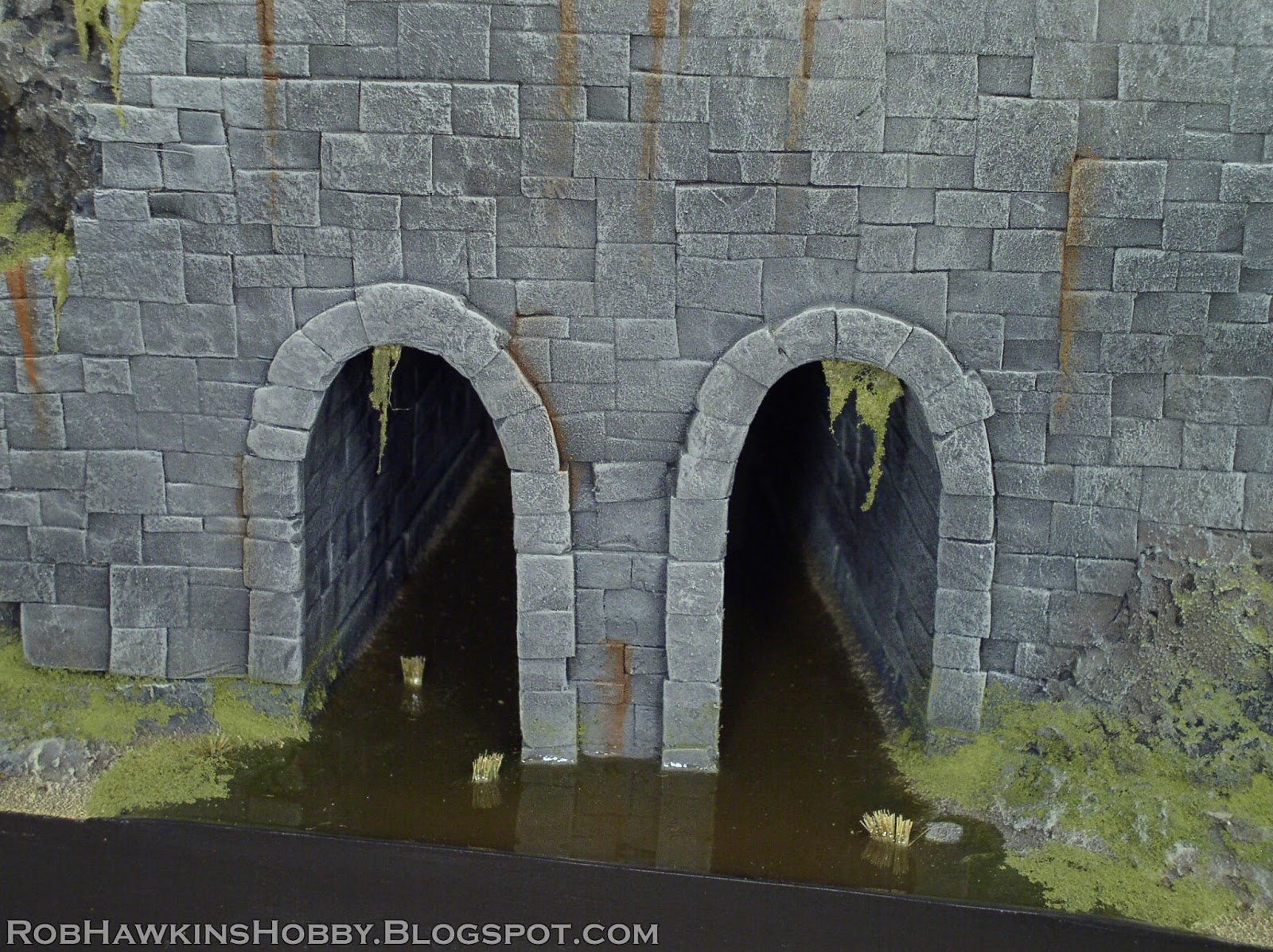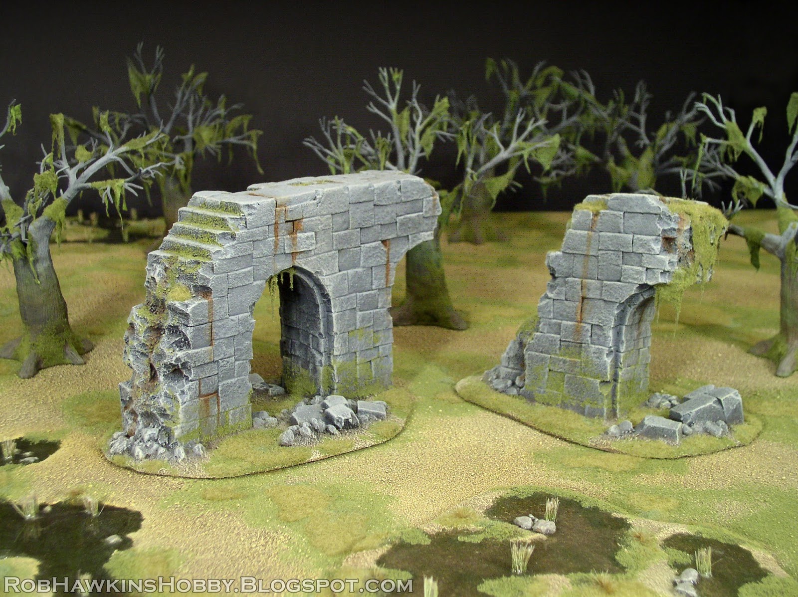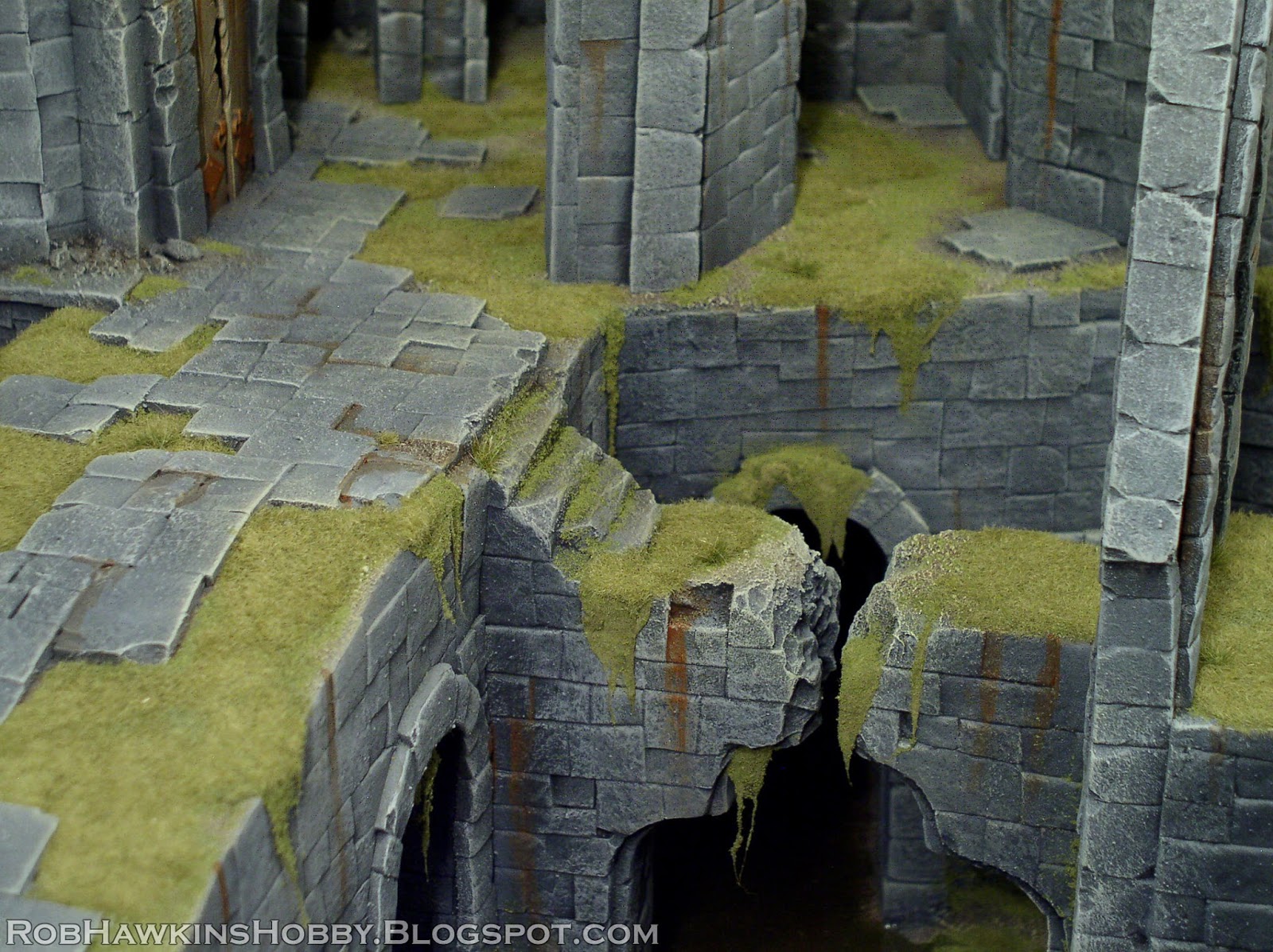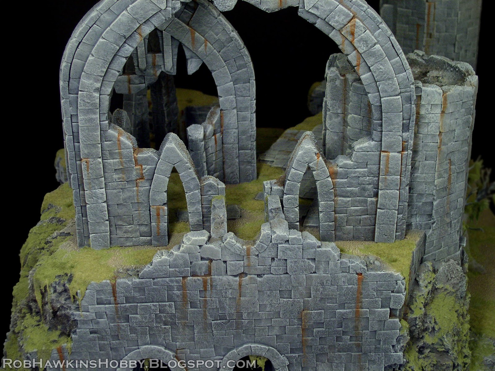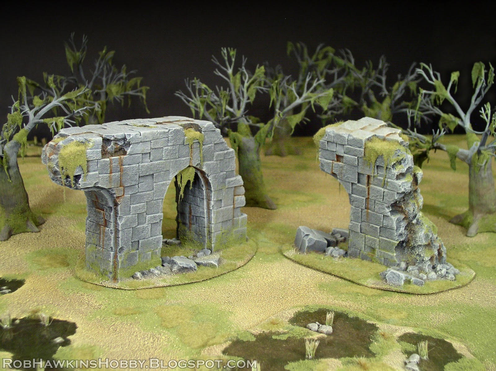 Okay– Last time, I had finished up the construction on the large component with the bridge and archways. I undercoated all of the stonework on the ruins with black latex paint, and then I sprayed them with greys to provide a solid base to drybrush over. I used a dark grey spray everywhere, and then used a lighter grey for a "zenith" highlight, basically spraying the piece from above to dust the tops and raised areas with the lighter color. The bottom edges of the stones remained dark, creating natural highlight and shaded areas.