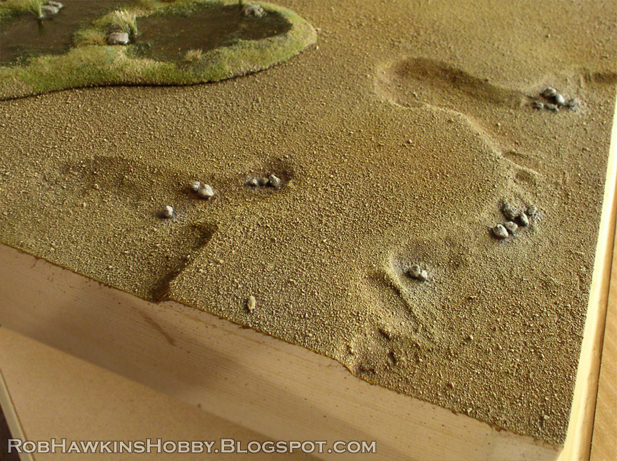 When the spraying was finished, I painted the ground with a basecoat of dark brown latex paint to help seal the sand and provide the base color.