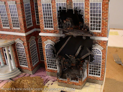 The additional damage was created by cutting and pressing the bricks in, and brushing black and grey over top of the blast marks.