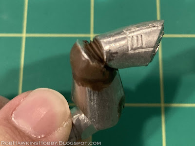 With the gun arm attached, I could finally position the head. I filled the neck cavity with putty, and pressed the head in place. Once the putty was cured, I glued on the head, and now Magnus is properly looking where he's firing.