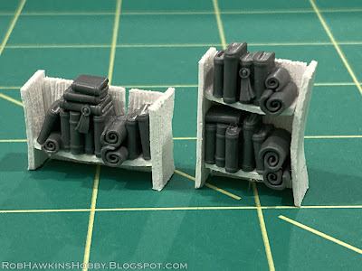 Here are the finished bookshelves. As I was typing this, however, I started to think that the wooden shelves don't really match the aesthetic of the rest of the army, or the basing. I don't really have wooden structures, or wooden bits on my basing, it's mostly tombstones, masonry, and skulls. So I think I'm going to have to come up with a more in-theme style of bookshelf for the Scriptor Mortis and his many tomes.