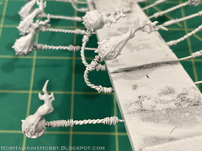 I had bent a few of the censer ropes as I was building, but realized that I'd need to keep track of which censer fit with which rat, and I didn't want to keep track of all that, so I left the rest of the ropes straight. After I paint the censers, I'll bend the ropes and fit them to their model. I'll have one final part for this tutorial about painting the smoke on the censers.